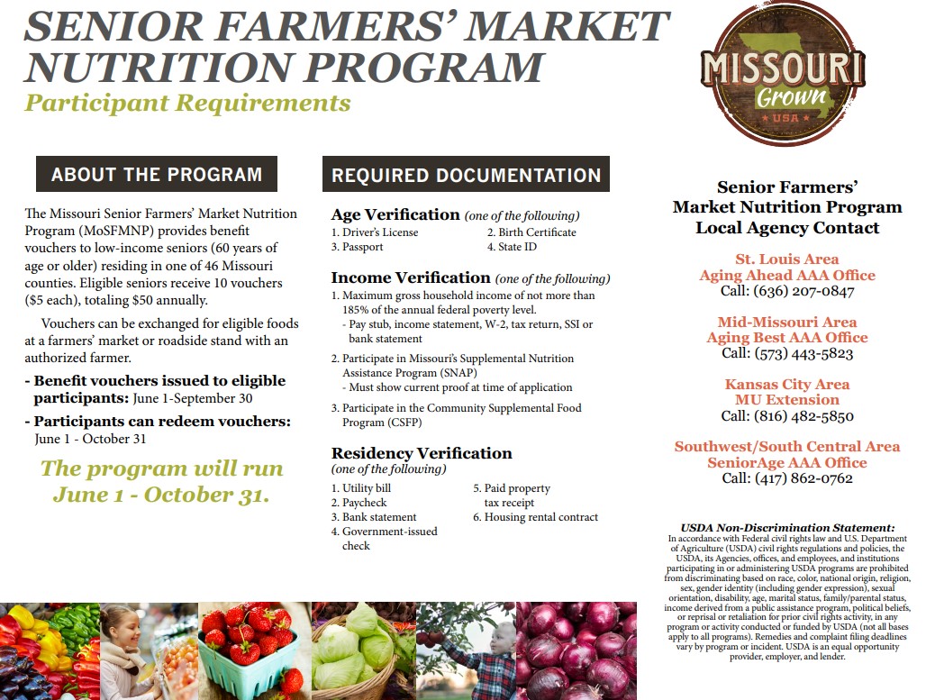 The Missouri Senior Farmers' Market Nutrition Program (MoSFMNP) provides 10 vouchers ($5 each) to income eligible seniors 60 years of age or older to be exchanged for eligible foods with an authorized farmers' market.